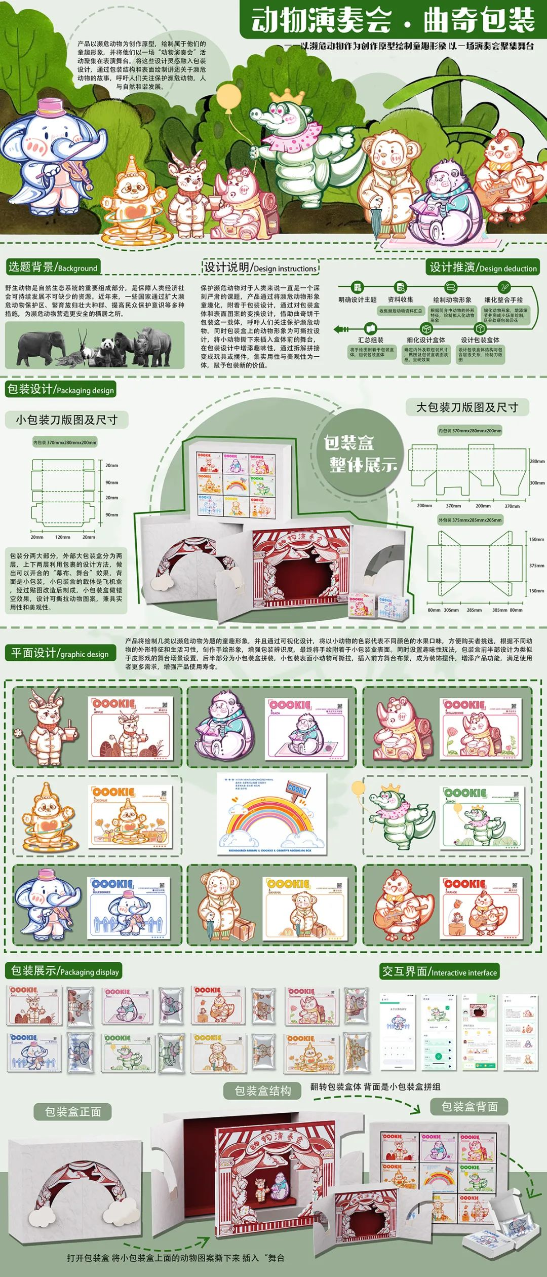 本产品将濒危动物形象童趣化,应用于包装设计,通过对包装盒体和表面图案的变换设计,借助曲奇饼干包装这一载体,呼吁人们关注保护濒危动物。包装盒上的动物形象为可撕拉设计,将小动物撕下来插入盒体前的舞台,在包装设计中增添趣味性,通过拆解拼接变成玩具或摆件,集实用性与美观性为一体,赋予包装新的价值。