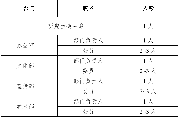 研究生会设有主席1名,下设四个部门,分别为办公室、文体部、宣传部、学术部,其中办公室负责人1人、委员2~3人;文体部负责人1人、委员2~3人;宣传部负责人1人、委员2~3人;宣传部负责人1人、委员2~3人;学术部负责人1人、委员2~3人。