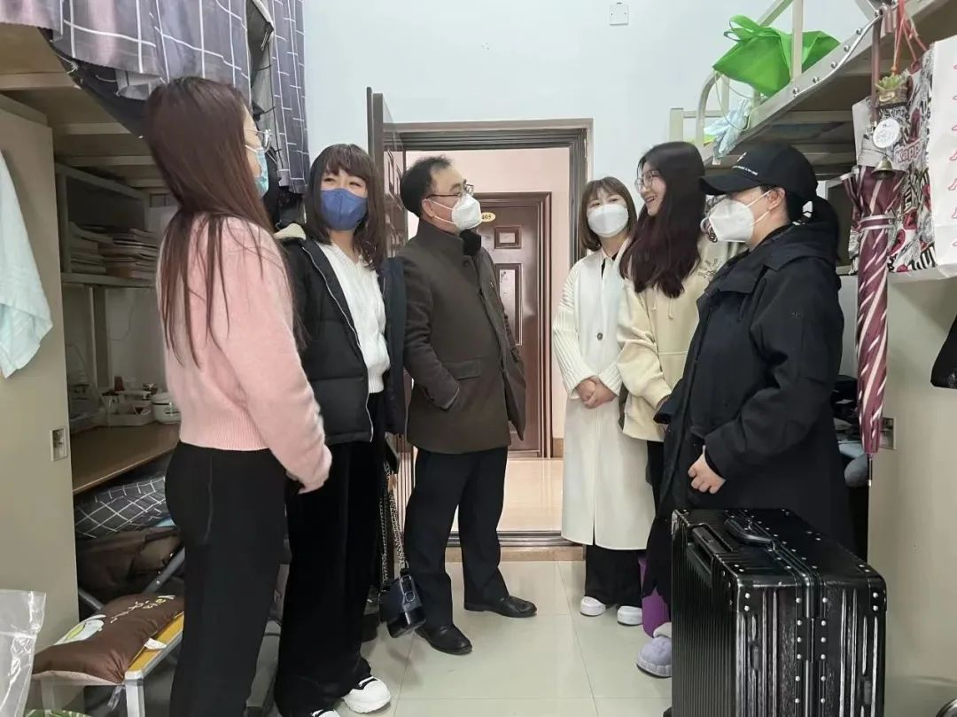 领导和老师们来到学生公寓,他们和蔼可亲的态度及幽默风趣的谈吐拉进了我们的距离,给我们送来了温情。领导们仔细询问了我们对新环境的适应状态,问我们对于新学期的计划并鼓励我们要不畏艰难。领导们的每一言每一语无不体现着对我们的关心,亲情般的关怀和温馨沁入我们的心中。