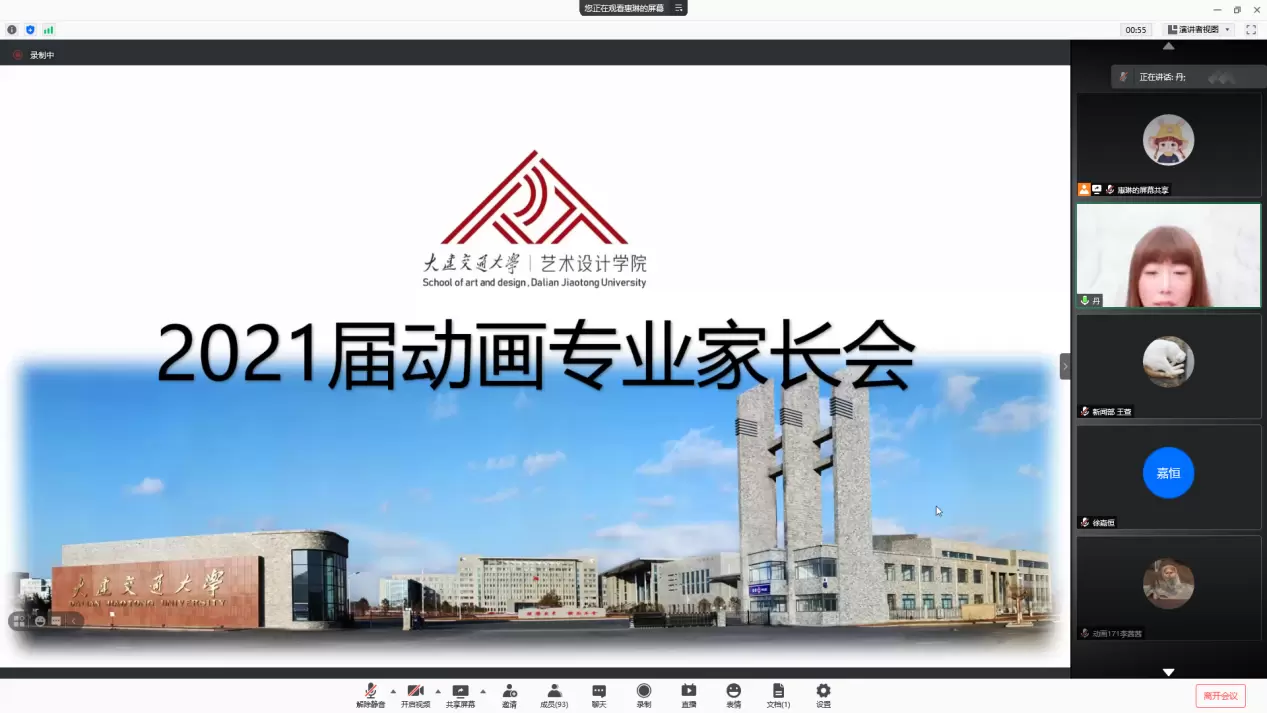 班子成员、动画专业韩宇教授出席会议、2021届动画专业全体毕业生和家长参加会议。会议由2021届毕业班辅导员付惠琳主持。