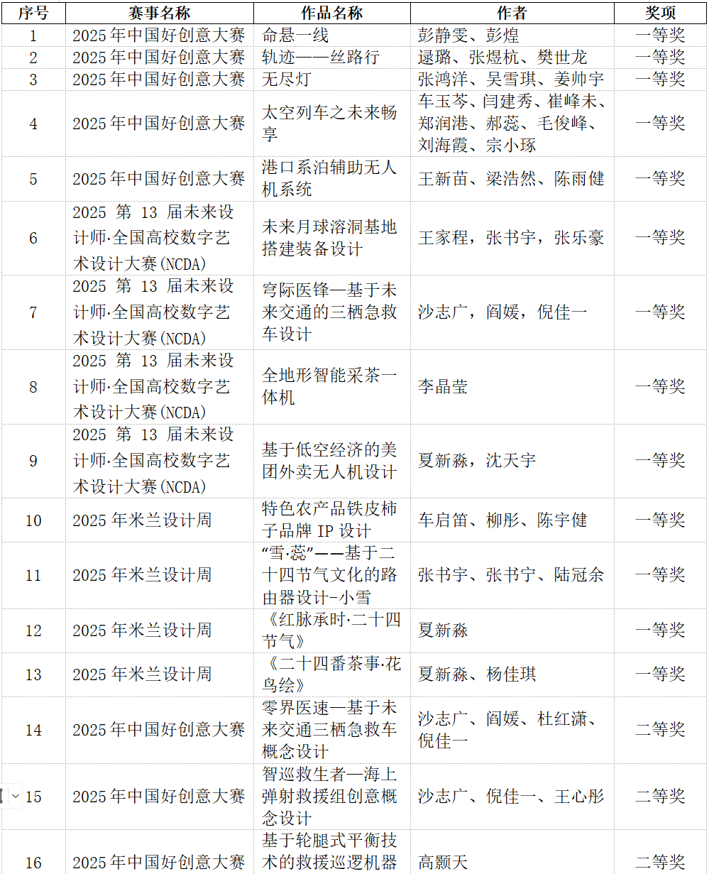 2025年度多项全国性设计学科竞赛获奖名单相继公布,我院学子发挥出色,在多个权威赛事中屡创佳绩,累计荣获国家级一等奖13项、二等奖16项、三等奖26项,优秀奖1项,充分展现了我院学子的专业实力与创新活力。